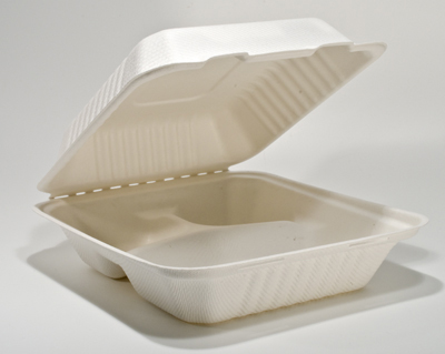 The 8in 3-Compartment Clamshell is a good take-out size with 3 separate compartments to keep foods from mixing. Replace your styrofoam or paper containers with a compostable AND annually renewable option! Bagasse is the left-over fibers from sugarcane juice extraction. Instead of being burnt, these fibers can be molded into foodservice items. Refrigerator, freezer, and microwave safe.